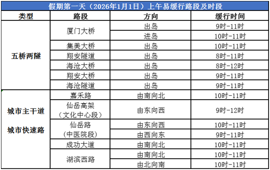 假期第一天(1月1日)上午,将出现小规模的去程高峰,车流主要集中在进出岛“五桥两隧”出岛方向、城市快速路、城市主干道。