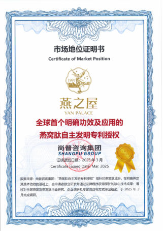 随着燕窝产品的创新和加工技术的提升,生物酶解技术也被应用于燕窝的加工中,随之诞生了“燕窝肽”。燕窝肽的研究,代表了燕窝行业从传统滋补迈向科学滋养的关键转折。燕之屋研发人员经过数百次测验,以定向酶切技术提取燕窝肽,从而使其拥有更加优异的功能性。这一突破性成果获得了权威机构的认可。经尚普咨询集团专业认证,燕之屋获得“全球首个明确功效及应用的燕窝肽自主发明专利授权⑤”市场地位证明书。