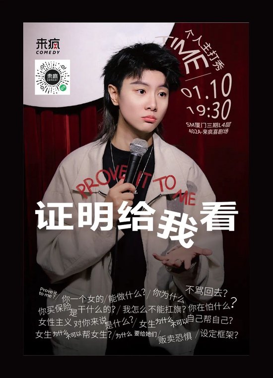生活中总有人在要求我们“证明”一些东西,例如裙子够不够长?能力够不够强?选择够不够正确?小菊的全新脱口秀专场《证明给我看》,选择用段子回应这些荒诞的审视,和大家聊聊这些自证背后的疲惫与荒诞,用幽默拆解枷锁。观演并不限制观众性别,这次的内容只聊自己陷入各种自证陷阱中的愤怒,和主体意识增强对自己的影响。
