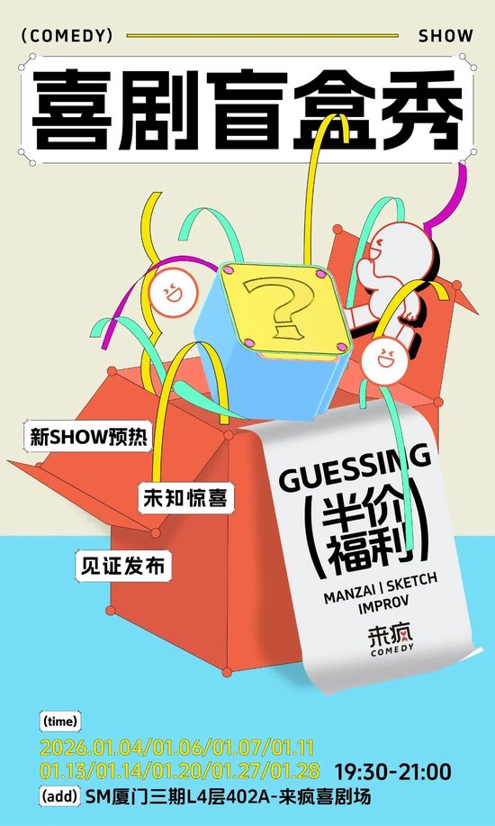 抽盲盒的快乐在喜剧场也能体验到,《喜剧盲盒秀》是来疯喜剧结合当下时代热潮推出的喜剧项目之一,在这场演出中,你可以随机解锁一种演出形式:可能是单口喜剧、素描喜剧、亲子喜剧、即兴喜剧、漫才喜剧等等,每场演员阵容与演员形式不尽相同,内容优质,笑点密集;全网高分好评,场场爆满。一定要来线下亲身体会,感受喜剧场拆盲盒的快乐。