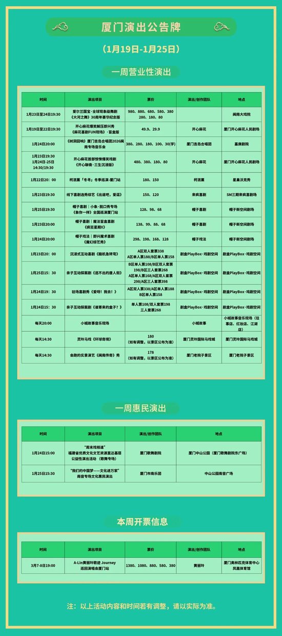 2、以上活动/演出资讯如有变动,请以各平台官方公告为准,户外场地因天气原因可能取消演出。