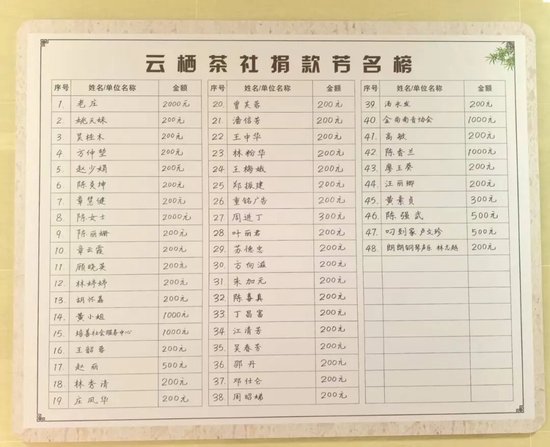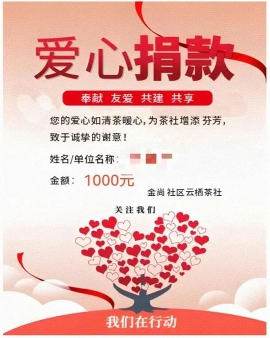 茶社里,捐款名单贴在醒目处。一位居民不小心打碎茶杯,立刻捐款十几元表示歉意。