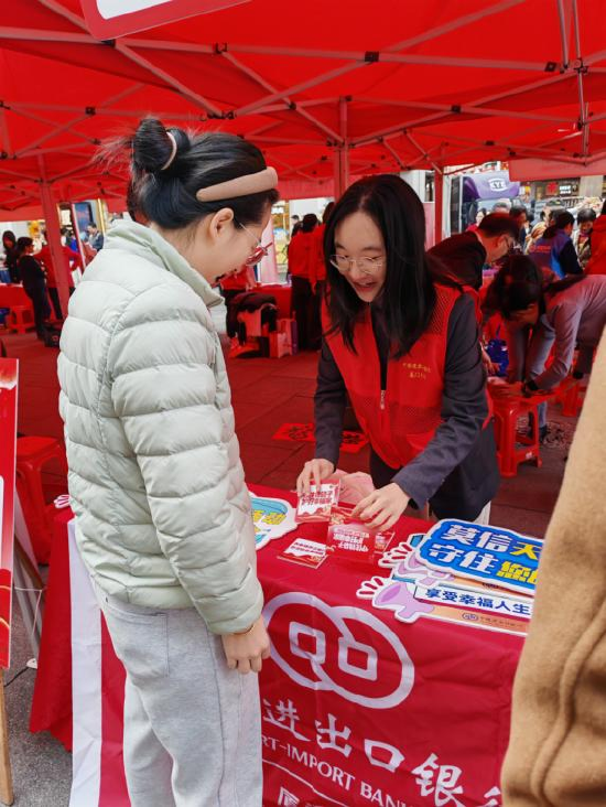 关注岁末迎新,福暖鹭岛。1月29日,“守护钱袋子 护好幸福家”2026年厦门市银行业保险业防非宣传暨“非遗迎新春・金融护家园”专场活动在思明区中山路步行街热闹启幕。进出口银行厦门分行响应号召,积极投身此次宣传活动,为市民送上一份特殊的新春“安全礼”,助力筑牢金融安全防线。