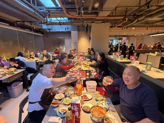 千人同涮一片海,千杯共敬一城春。这晚的寄海,像一个巨大的会客厅。在“干杯”的声浪里,一个家庭的欢庆升华为城市级的年味共振。“这一刻,年味不是屋檐下的方寸烟火,是整座城为‘见一面’举杯的仪式感。” 现场的一位黄哥说自己也是第一次见到这种场面。