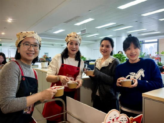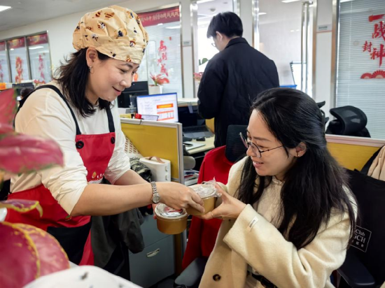 随着早高峰的打卡声响起,这场温馨的“投喂”行动正式拉开帷幕。餐车穿梭于各个楼层与甬道,成为了职场里一道流动的风景线。工会小伙伴亲手将热气腾腾的汤圆送到每一位员工的工位上。“元宵节快乐!”一声声亲切的问候,一碗碗软糯的香甜,让原本紧张忙碌的职场瞬间充满了欢声笑语。