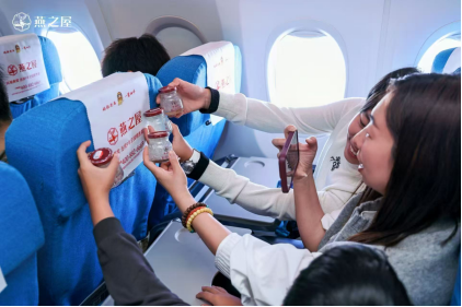 主题航班客舱内,燕之屋品牌logo与妇女节温暖寄语为每一位旅客带来登机后的第一份问候与惊喜。乘务长通过广播向全体旅客致以节日问候,并预告燕之屋带来的惊喜互动与心意好礼,拉满期待值。待航班平稳飞行,“爱自己”的悦己滋养与珍爱仪式在云端温暖展开。燕之屋精心准备节日礼物——燕之屋鲜炖燕窝,由乘务组送至机上每一位旅客的手中,解锁机上吃燕窝的全新体验。
