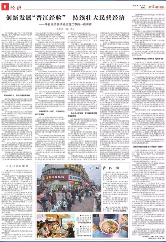 关注3月25日,《新华每日电讯》第06版刊发《创新发展“晋江经验” 持续壮大民营经济——来自经济重镇福建晋江市的一线观察》。一起来看详情——