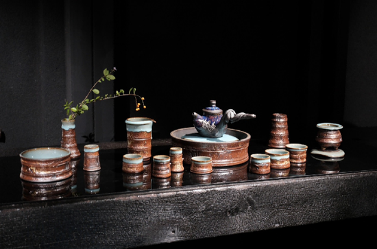 台湾艺术家邱秀三将书法、陶艺、茶道相融,《茶器套组——竹节》《茶器套组—福潤故鄉》等作品温润清雅;