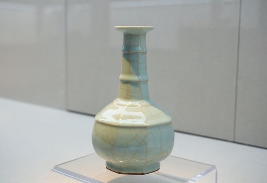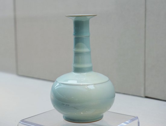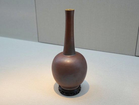 南宋官窑传承人金国荣《八方弦纹盘口瓶》为南宋官窑经典器形,以杭州特有的紫金土为胎,承袭宋代官窑典雅器韵。