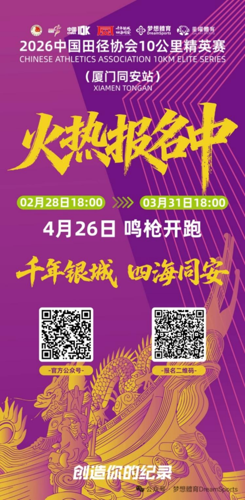 据悉,赛事报名时间为2月28日18:00至3月31日18:00,更多赛事详情及报名通道,可关注赛事官方公众号“梦想體育DreamSports”或扫描报名二维码即刻参与。千年银城启新程,四海跑者聚同安,这场融合专业与美景的10公里精英赛,期待全国跑者齐聚同安湾,跑出属于自己的精彩纪录。