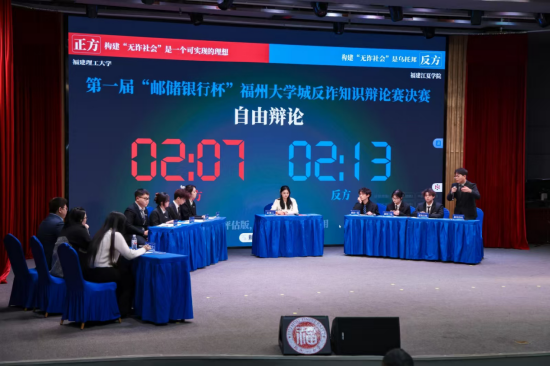 关注第一届 “邮储银行杯” 福州地区大学城反诈知识辩论赛总决赛,近日在福州大学圆满举行。本次大赛以 “思辩明理,反诈同行” 为主题,由福州市公安局上街(高新区)分局、福州大学法学院、邮储银行福州市分行联合举办,联动辖区16所高校共同参与,旨在通过创新宣传形式,强化高校师生电信网络诈骗防范意识与能力,筑牢校园金融安全防线,厚植 “全民反诈、全社会反诈” 的浓厚氛围。
