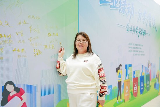 此外,活动现场还设置了主题打卡区,融入垃圾分类知识及签名墙,参与者拍照并发送朋友圈集赞5个,即可领取纪念品一份。职工们纷纷在背景墙前合影留念,分享活动瞬间,进一步扩大了垃圾分类宣传的传播力和影响力。
