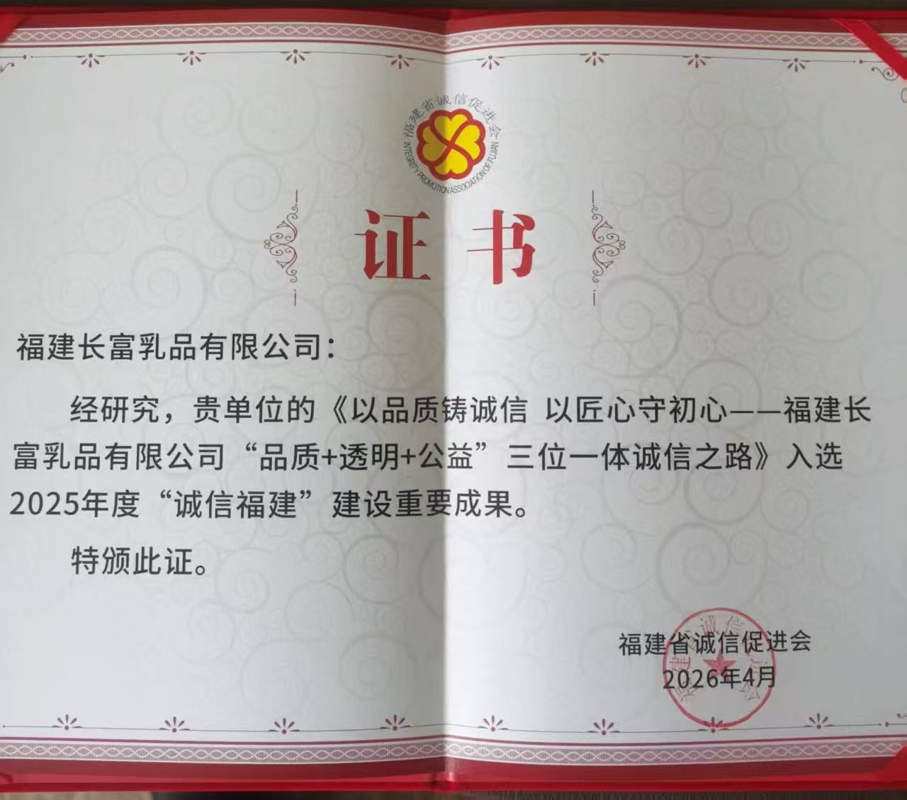 长富荣膺2025年福建省诚信建设创新实践十大优秀案例 铸就国产乳业信任样本