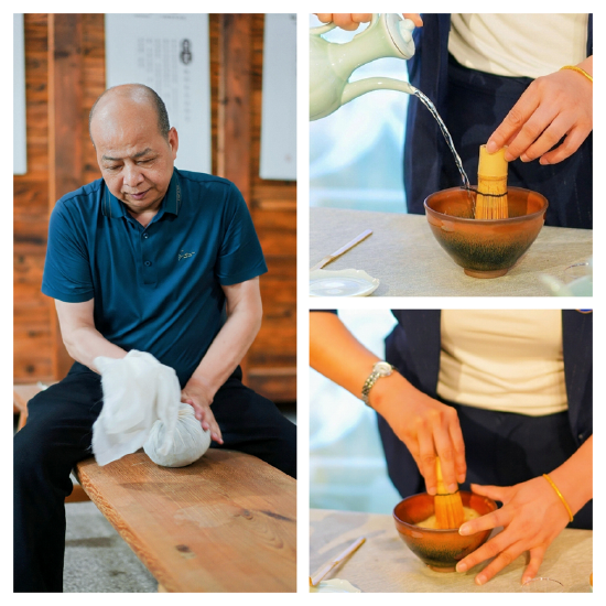 活动现场,一场唯美的茶艺表演优雅上演。茶艺师以行云流水般的手法,温杯、投茶、注水、出汤,将铁观音的冲泡过程升华为艺术表达。在非遗体验区,嘉宾们还亲手体验了宋代点茶——碾茶、注汤、击拂,在茶沫上绘制图案,感受“一盏茶汤里的东方美学”。茶香与雅趣交织,庄园的午后因茶而生动。